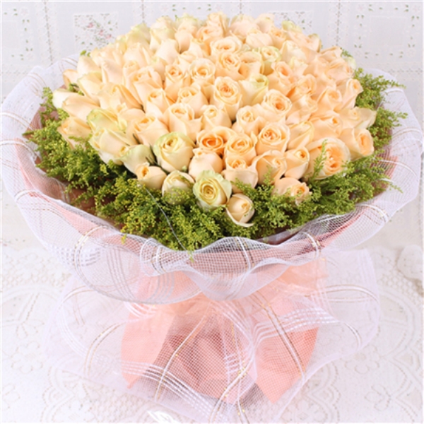 精心挑选66朵昆明香槟玫瑰,搭配美丽黄莺组成美丽花束。