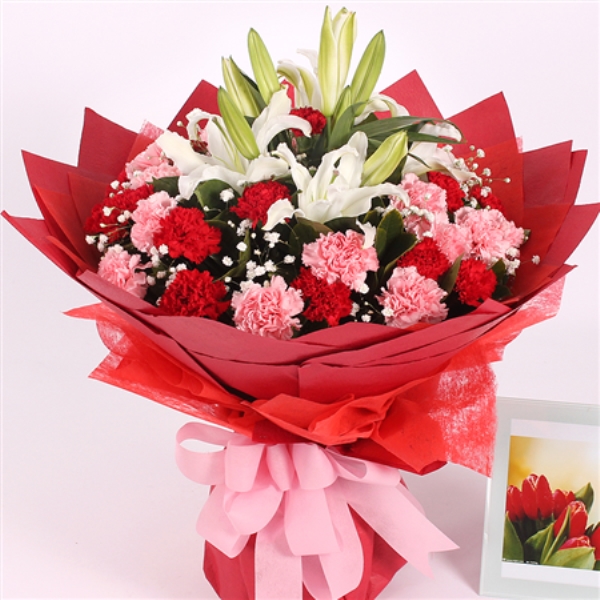 精心挑选11朵红色康乃馨和11朵粉色康乃馨,6朵百合,搭配栀子叶、满天星。