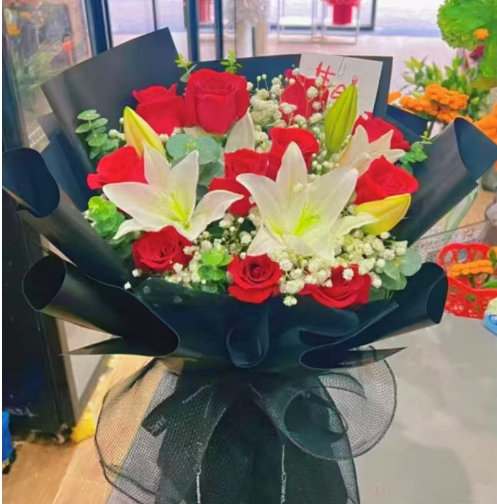 精选11枝红玫瑰,2枝多头百合,满天星 尤加利叶搭配