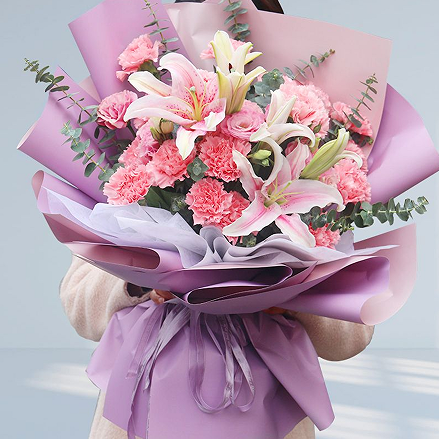 精选19枝粉色康乃馨,6朵粉百合,尤加利叶搭配