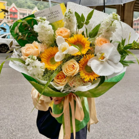 精选8枝香槟,3枝向日葵,1枝蝴蝶兰,1枝郁金香,4枝白色紫罗兰,喷泉草,七星叶搭配
