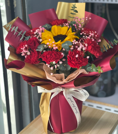 11支红色康乃馨,1枝向日葵,粉色满天星,尤加利叶丰满搭配