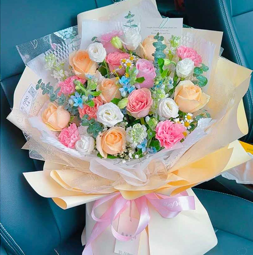 精选6朵香槟,5朵戴安娜,4朵粉色康乃馨,4枝白色紫罗兰,桔梗,蓝星花,尤加利叶,小雏菊搭配