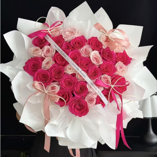 21枝佛洛依德玫瑰,16枝粉玫瑰,四个丝带如图制作