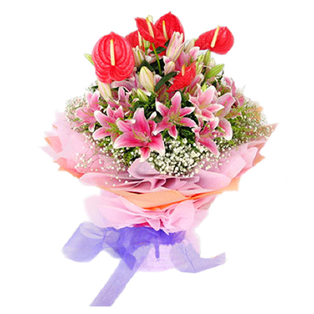 里层粉色、外层桔红色皱纹纸圆形包装,紫色丝带束扎。