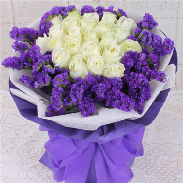 33支白玫瑰,紫色勿忘我围绕