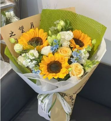 3枝向日葵,3枝香槟玫瑰,2枝白色紫罗兰,