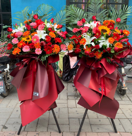 25支扶郎,11支红玫瑰,1支向日葵,6朵百合,散尾葵绿叶搭配