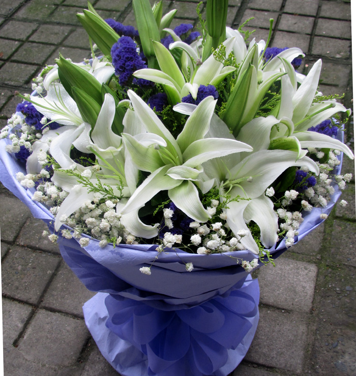 紫色皱纹纸高档圆形精美包装,配蝴蝶结束扎。