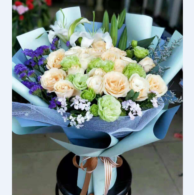 精选21枝香槟玫瑰 6朵百合 桔梗 勿忘我 情人草 相思梅搭配