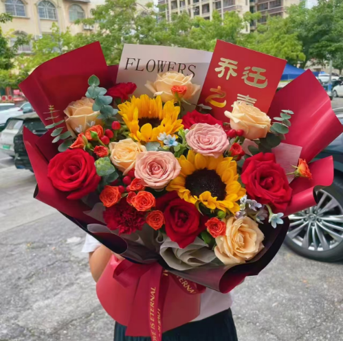 2枝向日葵,2枝红色康乃馨,橙色泡泡,蓝星花,