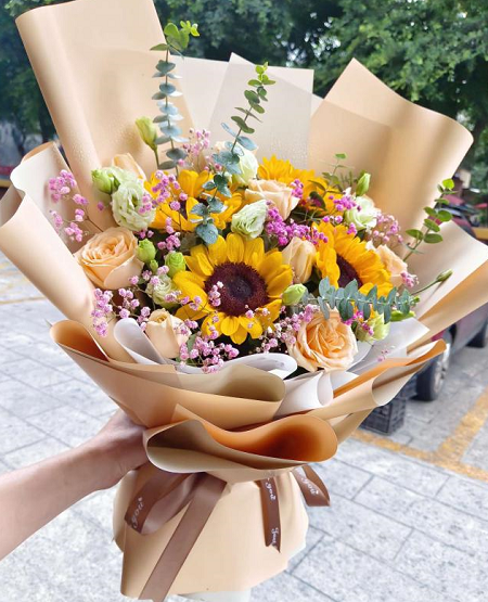 9枝香槟玫瑰,4枝向日葵,粉色满天星,洋桔梗,尤加利叶丰满搭配