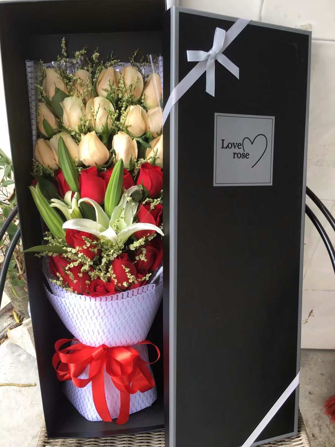 15枝香槟玫瑰,14枝红玫瑰,2枝多头白百合,水晶草搭配