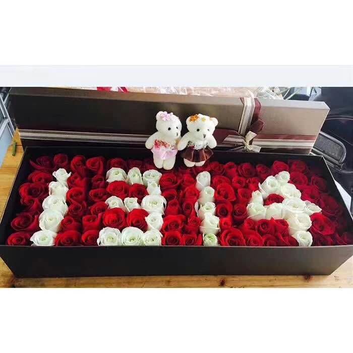 精选68朵红玫瑰,31朵白玫瑰拼凑数字“1314”,共99朵,加2只小熊。