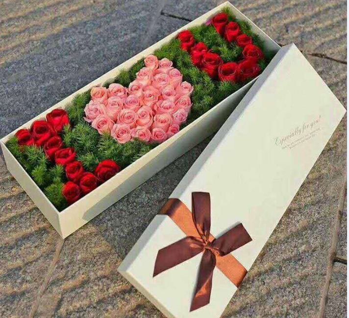精选18枝红玫瑰+ 25枝粉玫瑰,共43枝,拼出"I O U"样式。蓬莱松打底。